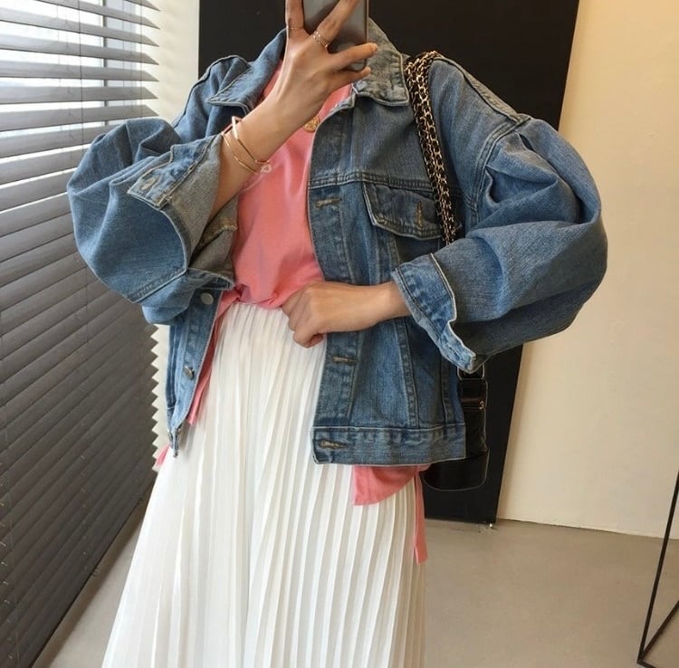 カジュアルになりがちなデニム素材も、ボリューム感のある袖のデザインで大人可愛い印象も。