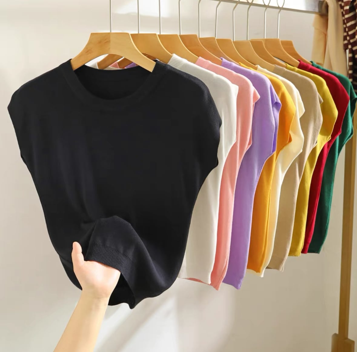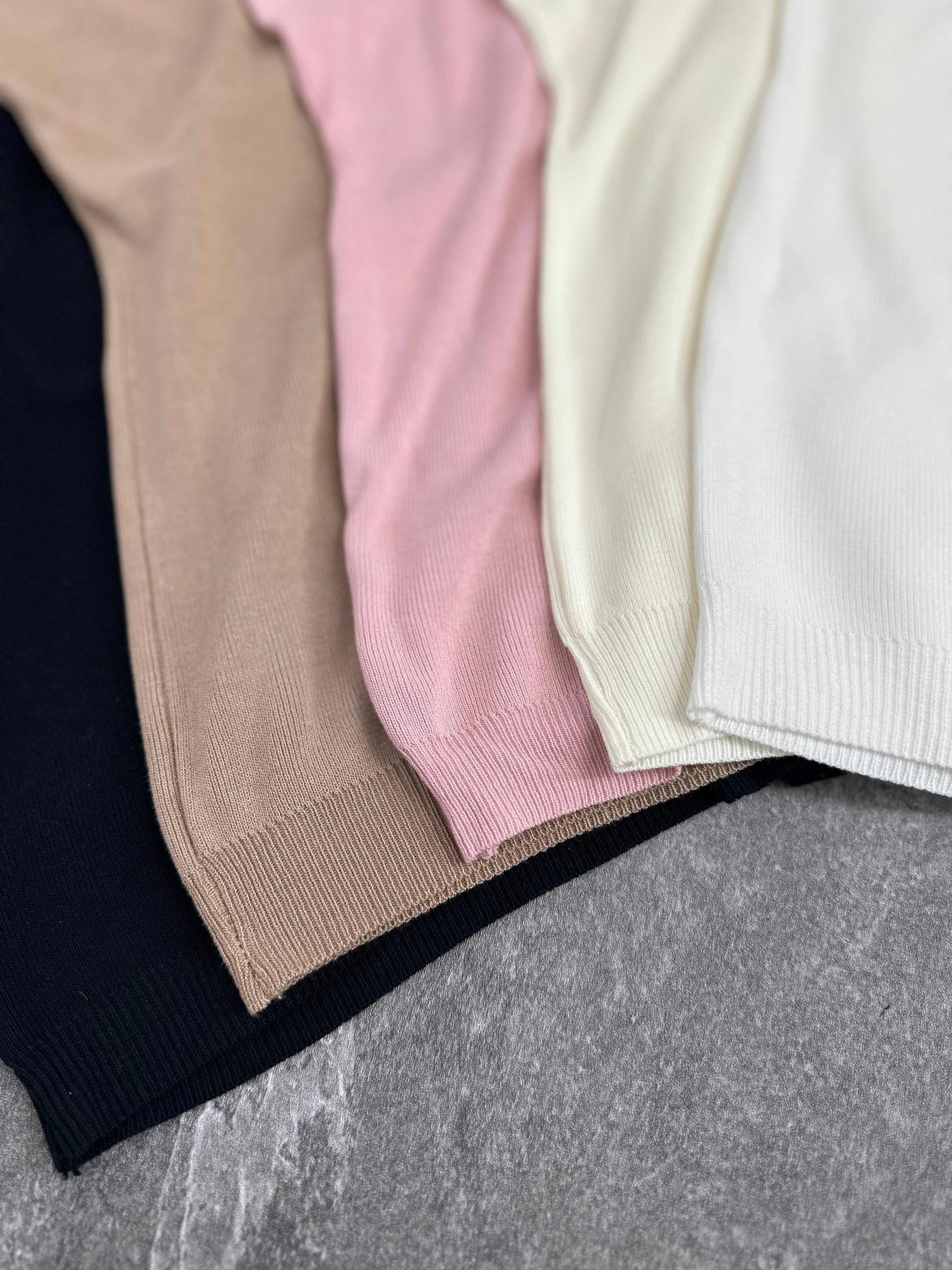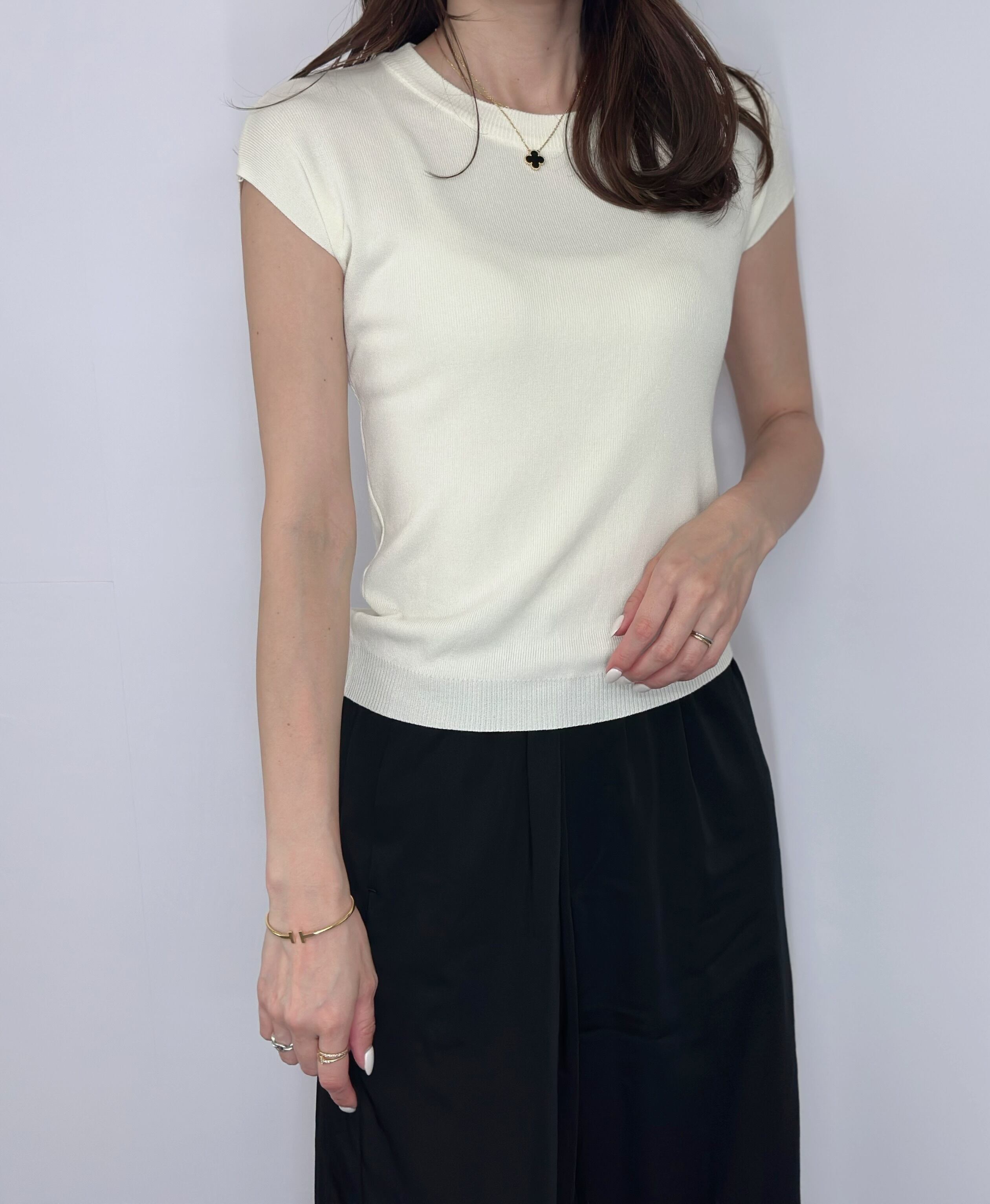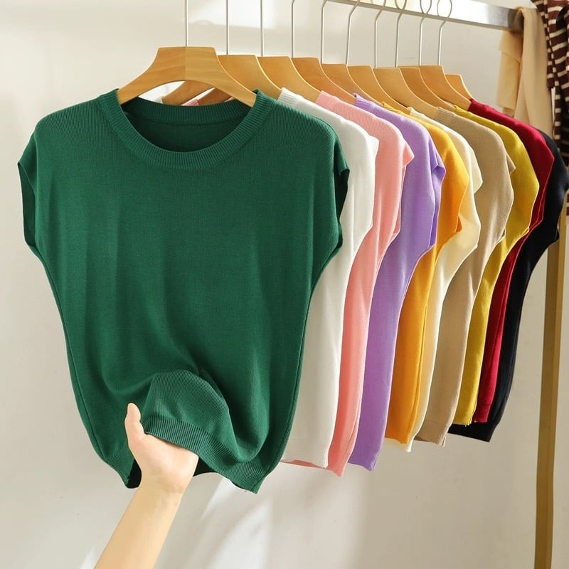 接触冷感素材のシンプルなサマーニットは、肌触りが涼しく、汗をかいてもサラッとした着心地をキープしてくれる逸品♪