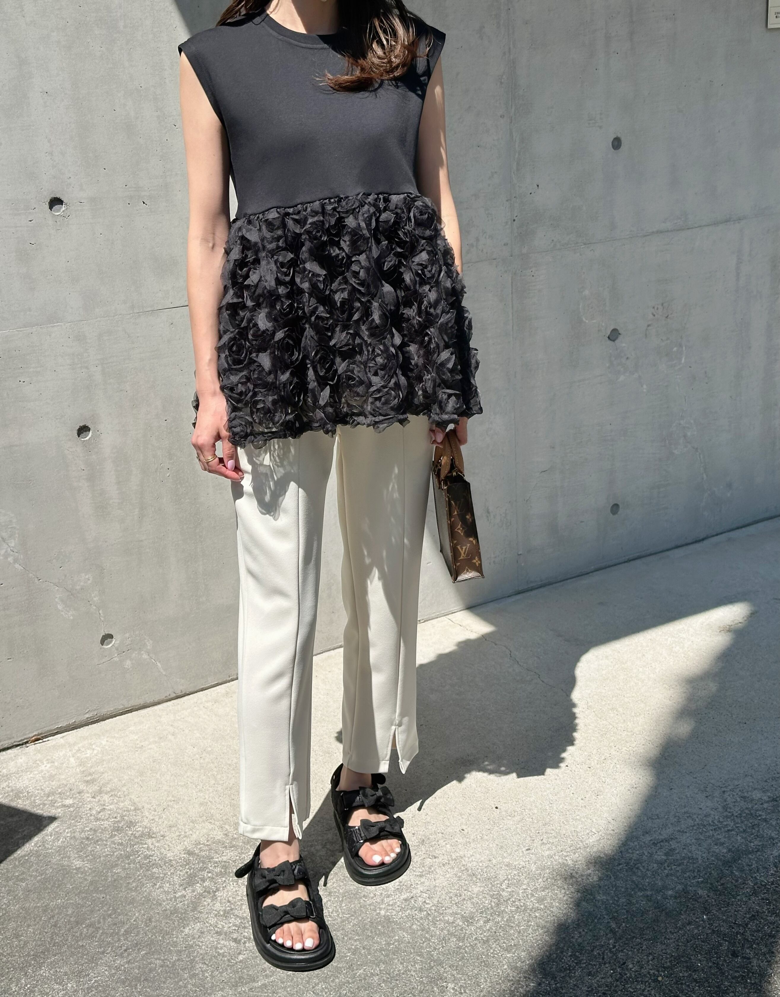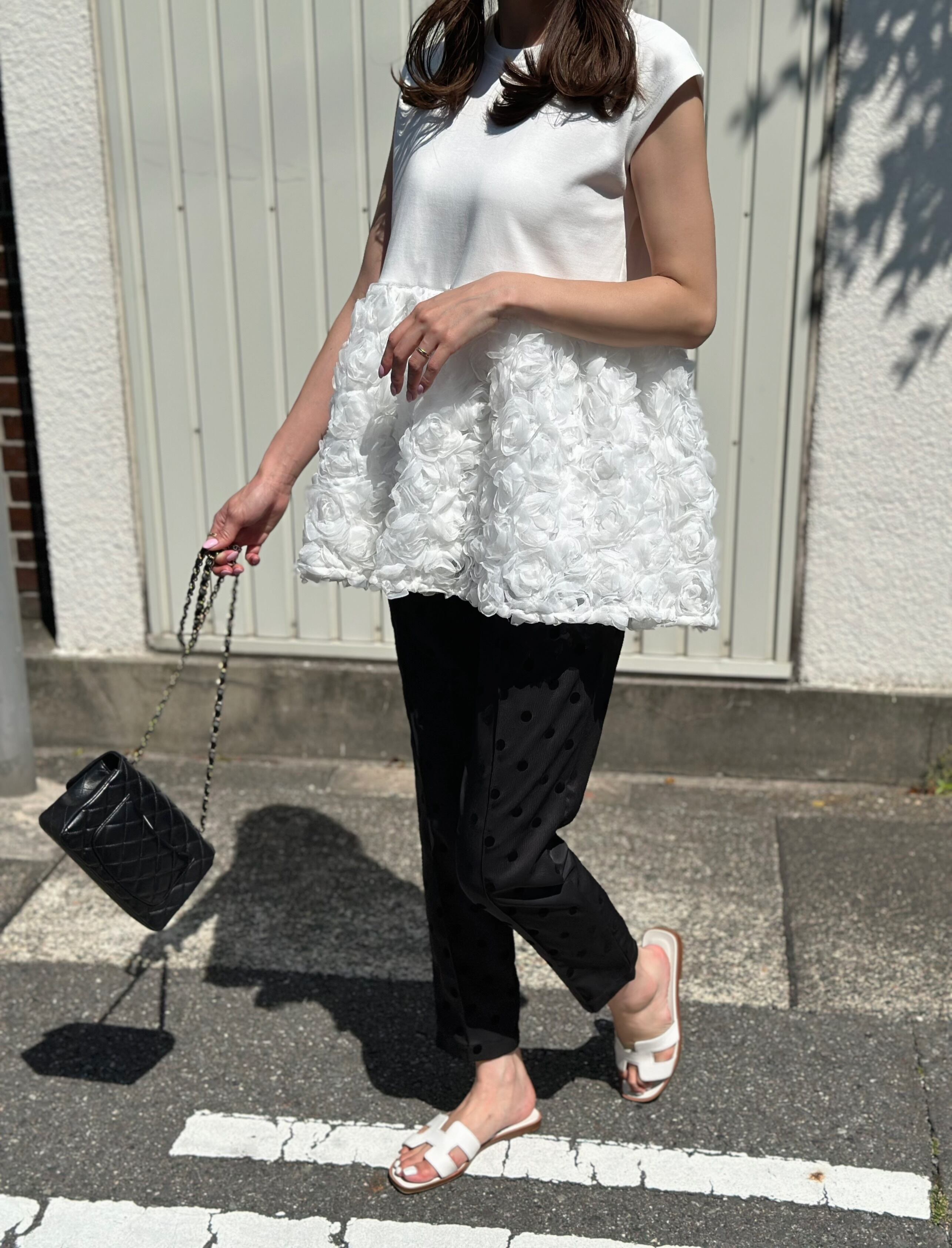 フローラルモチーフのボリュームたっぷりのドッキングトップスは、体型をカバーしながら女性らしいシルエットを演出♪