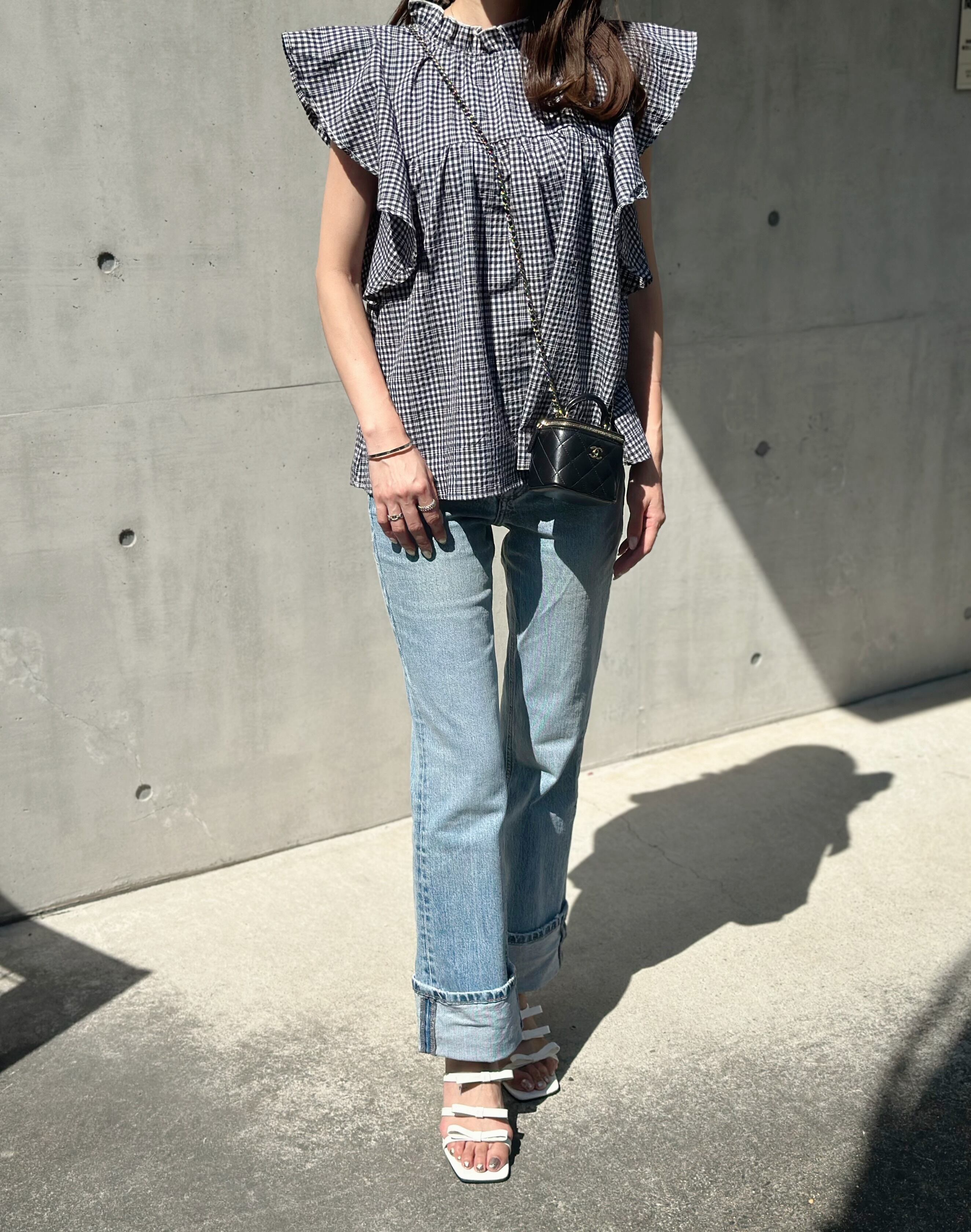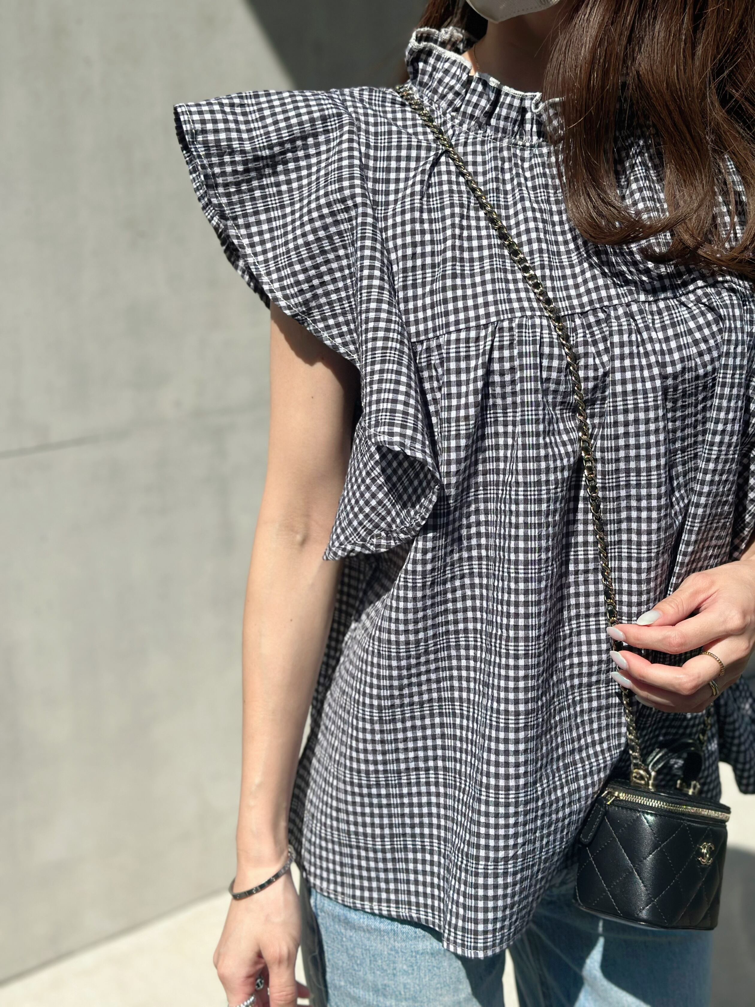 ボリュームたっぷりなフリルがショルダーとギンガムチェック柄が魅力的な、女性らしい印象のノースリーブトップス!