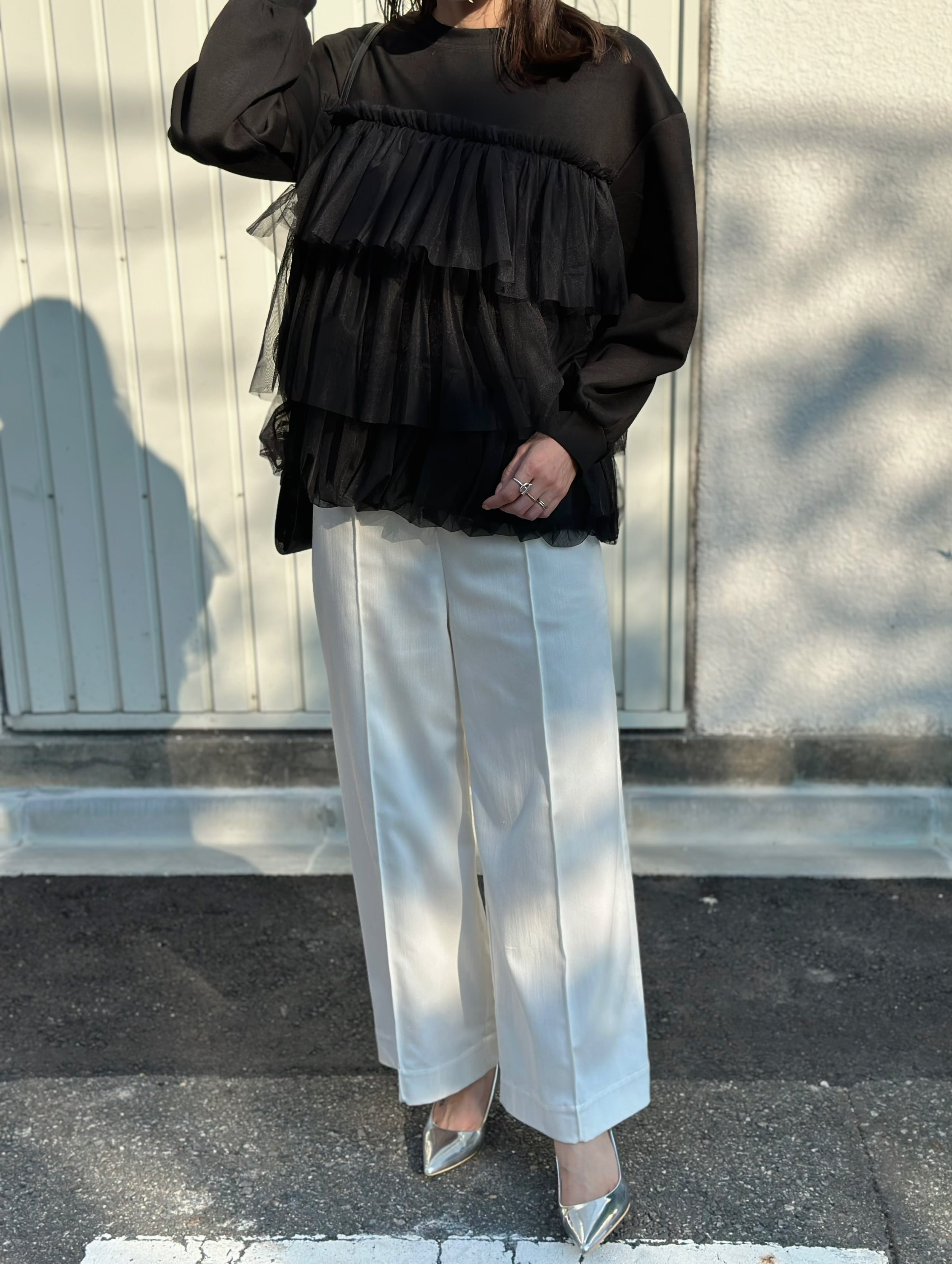 チュール部分が同系色で統一されているため、落ち着いた雰囲気を演出し大人カジュアルからキレイめまで、どんなスタイルにもピッタリ!!