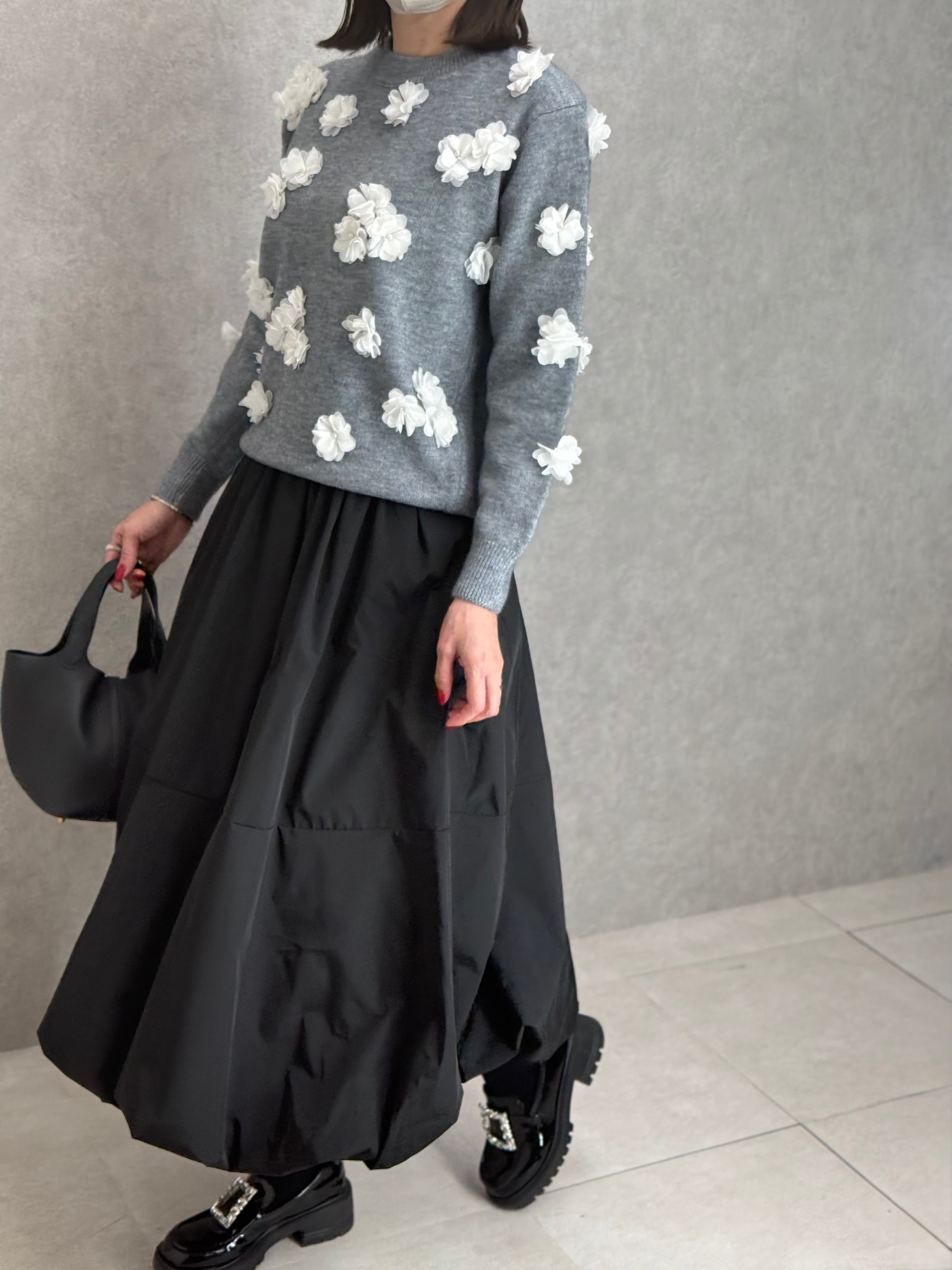 立体的なフラワーモチーフが施されたニットプルオーバーは、個性を引き立てる一枚♪