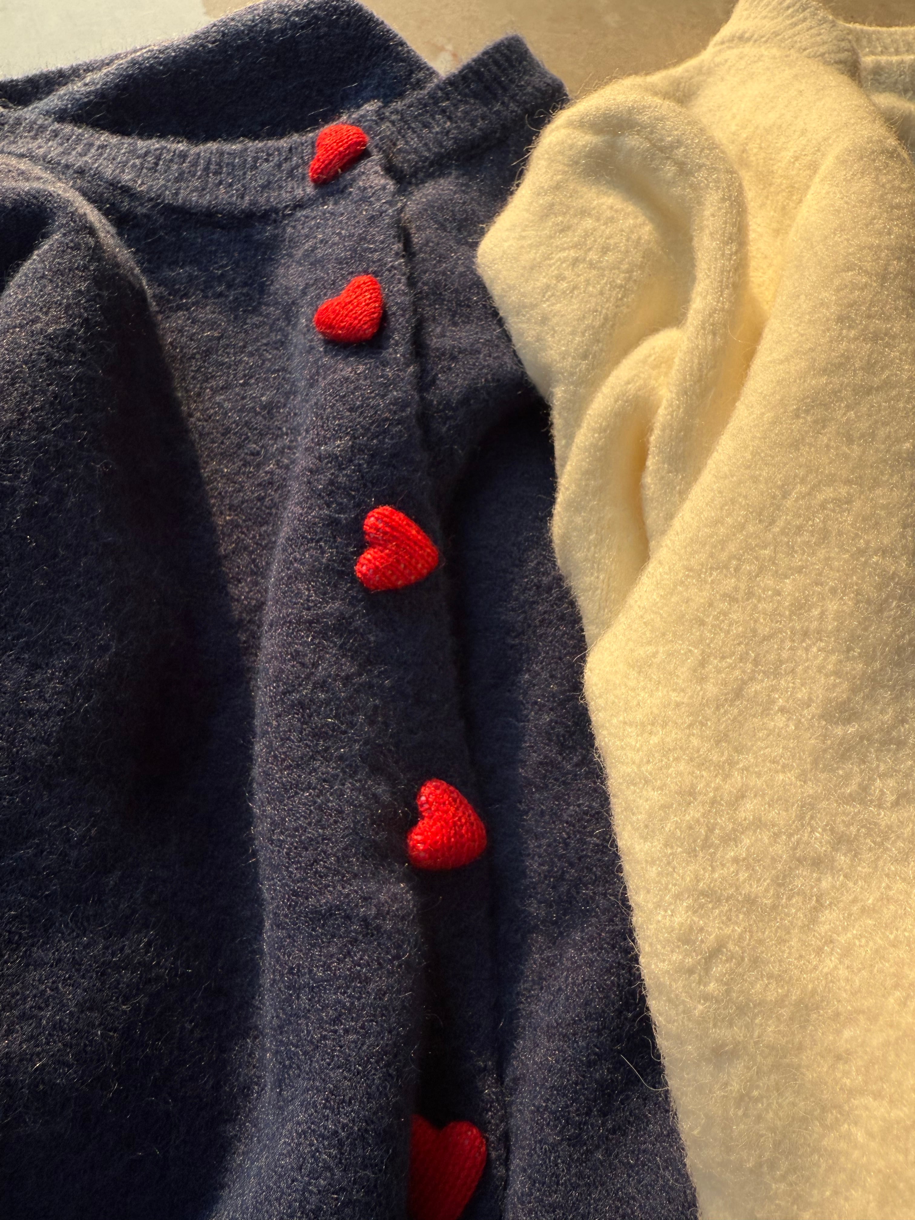 どのカラーを選んでも主役級の可愛さを演出してくれる、赤いハート型ボタンがとびきりキュートなカーディガンです!